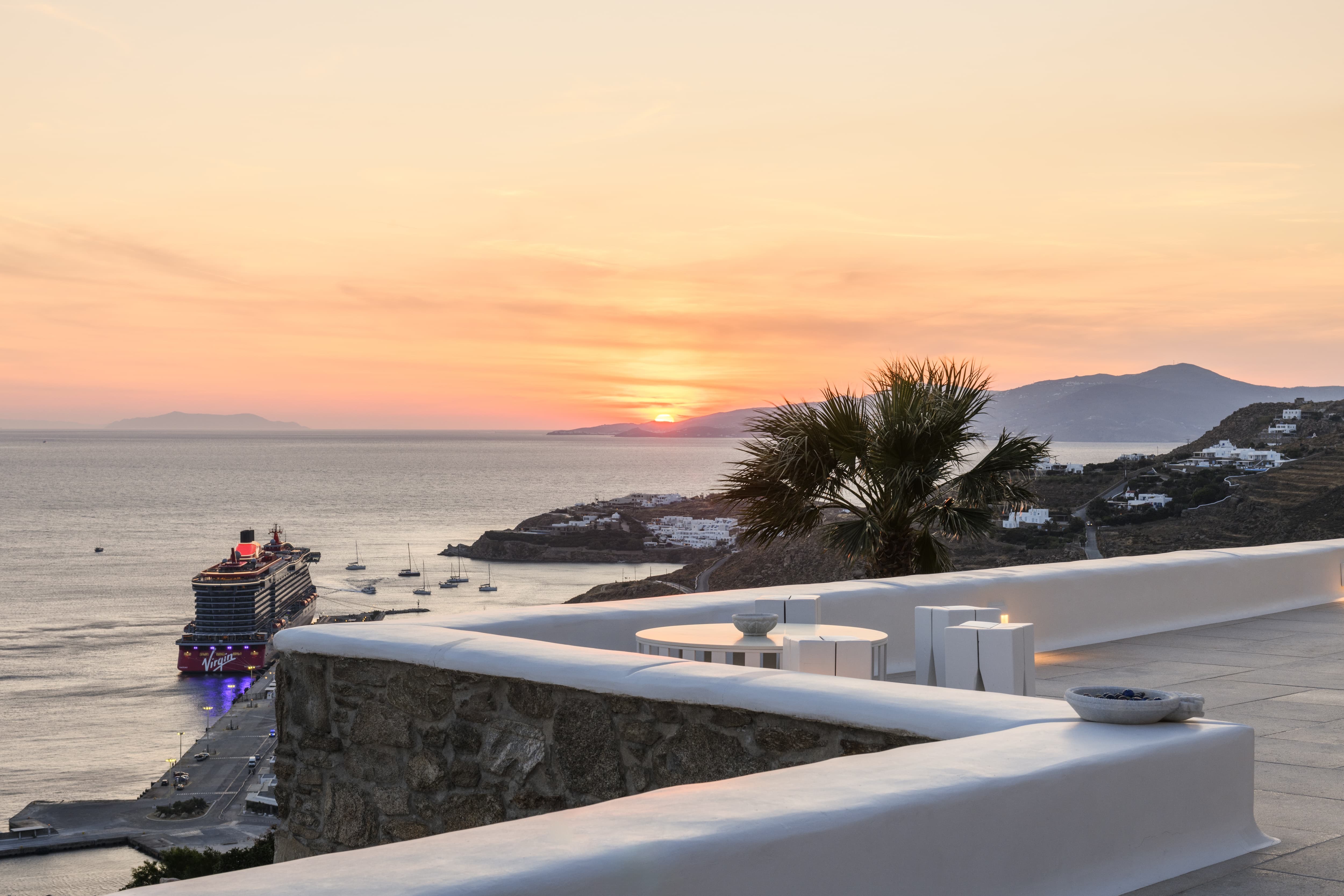 • Sunset dining overlooking Mykonos Town and the Aegean