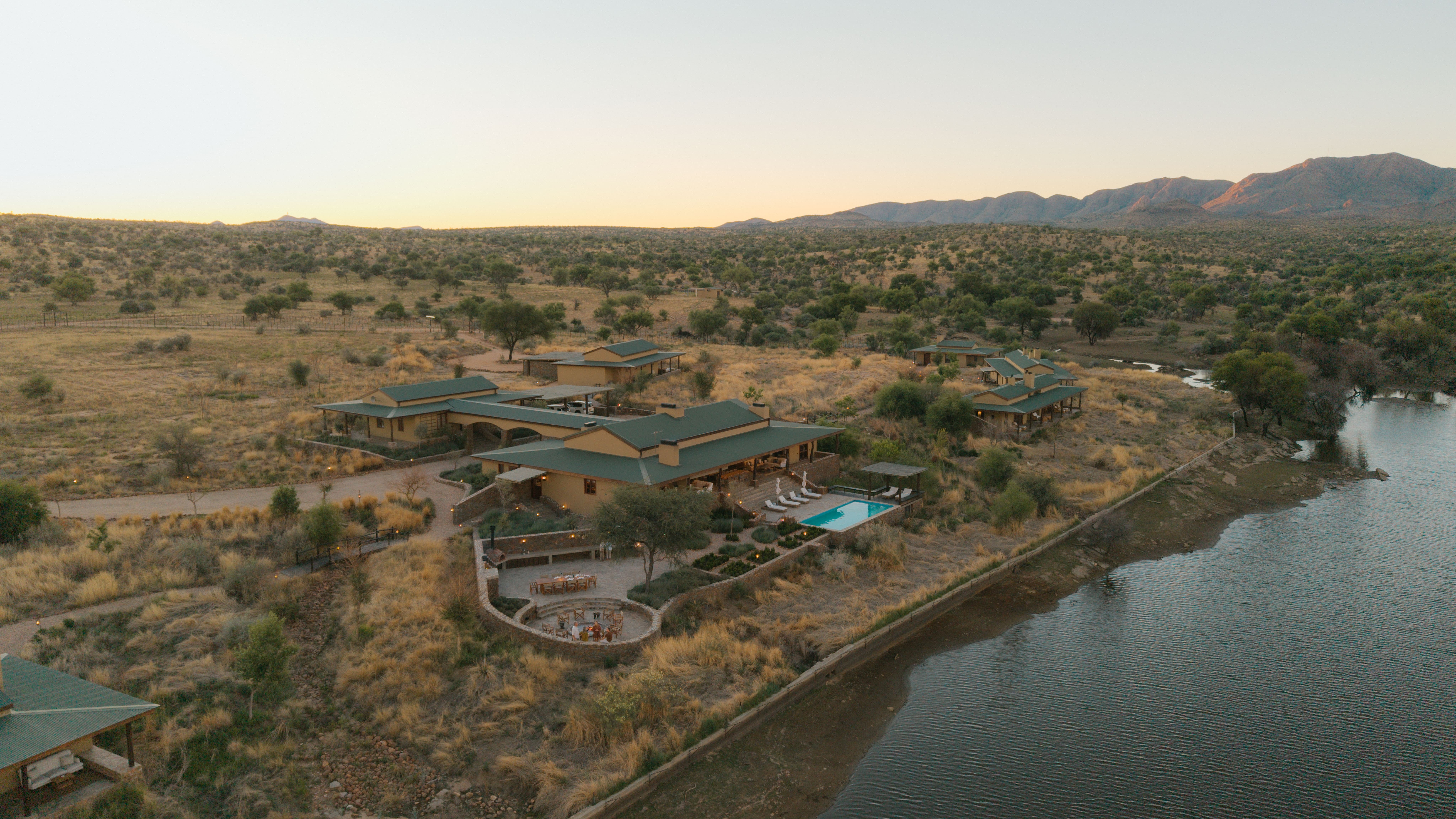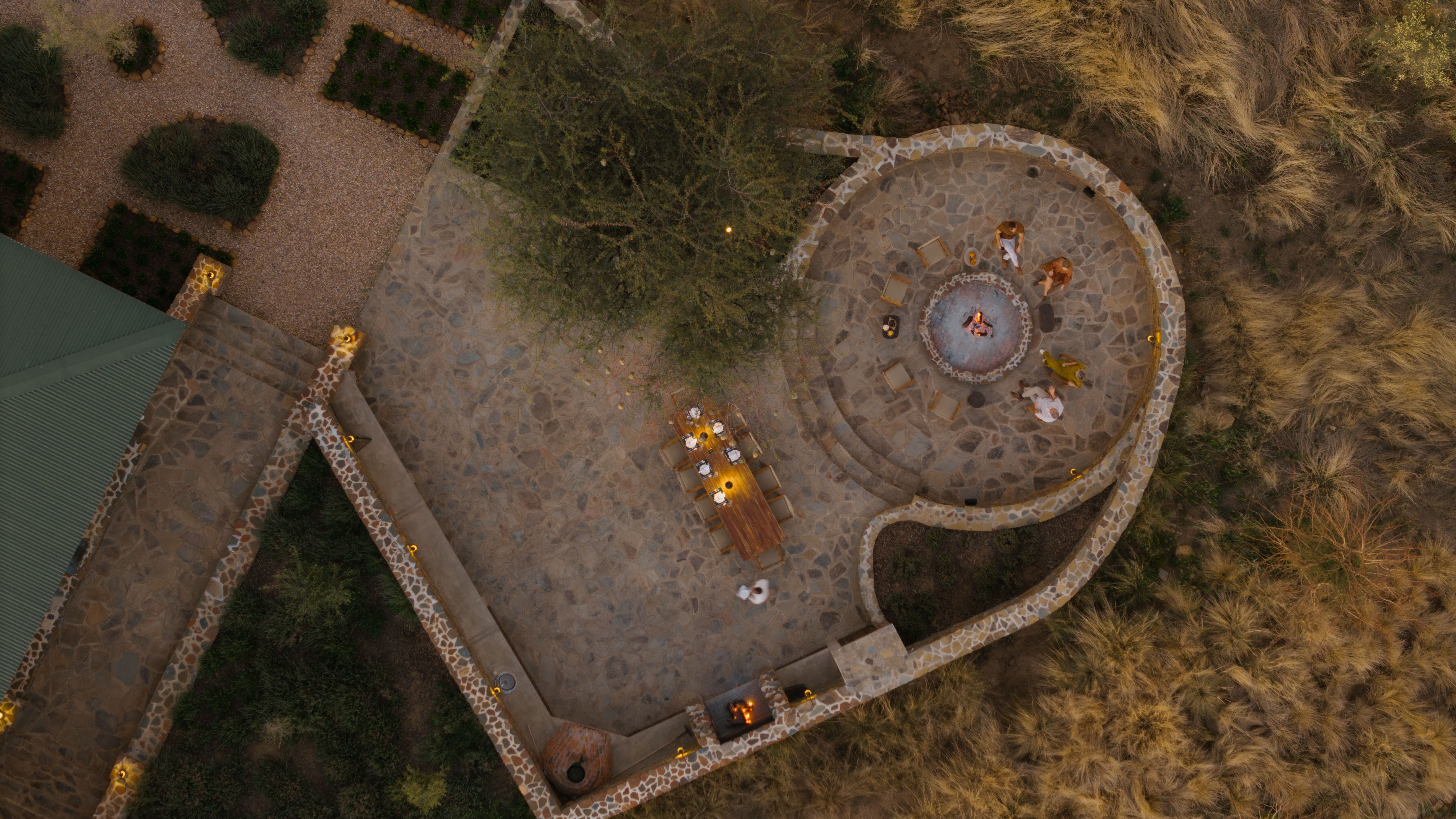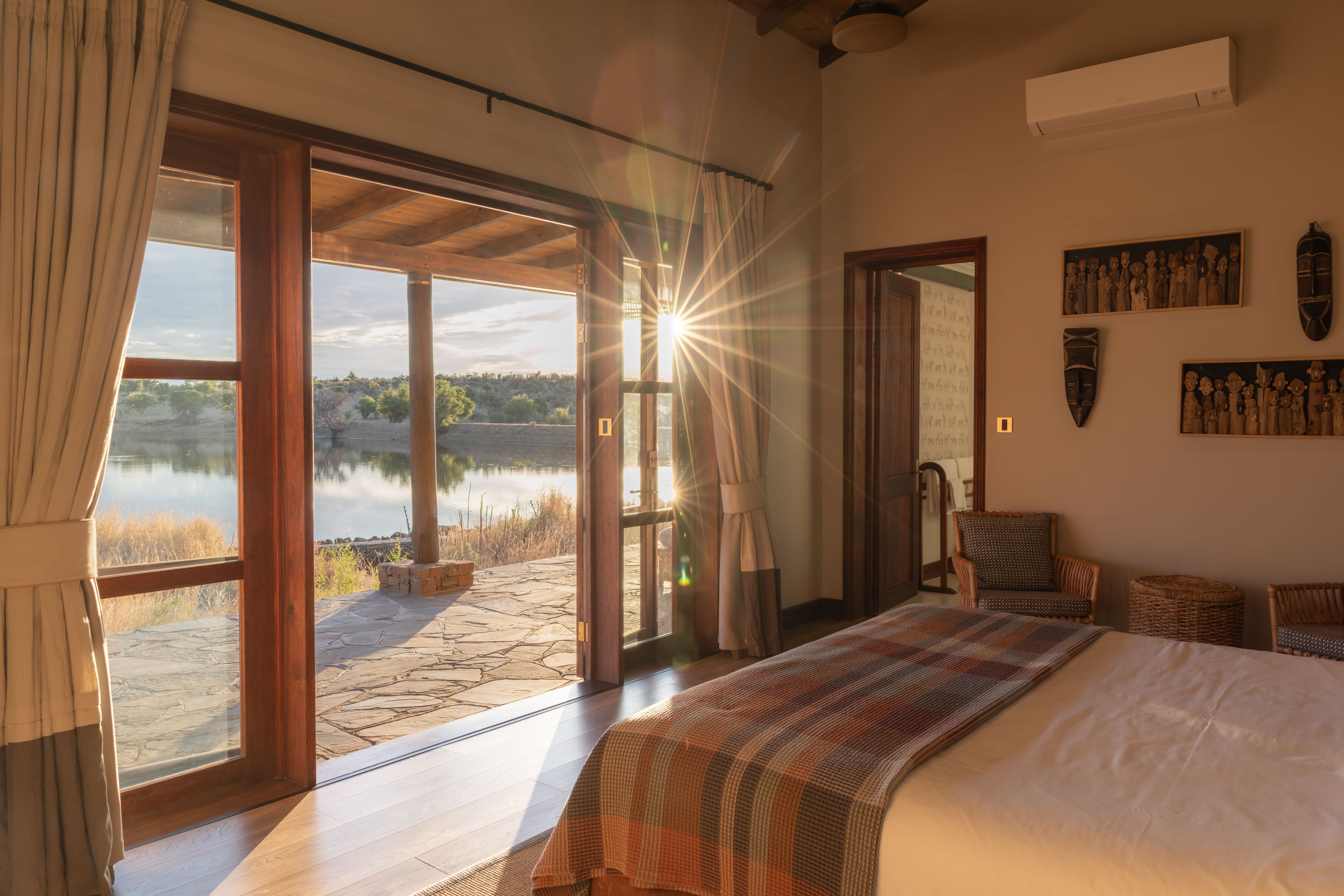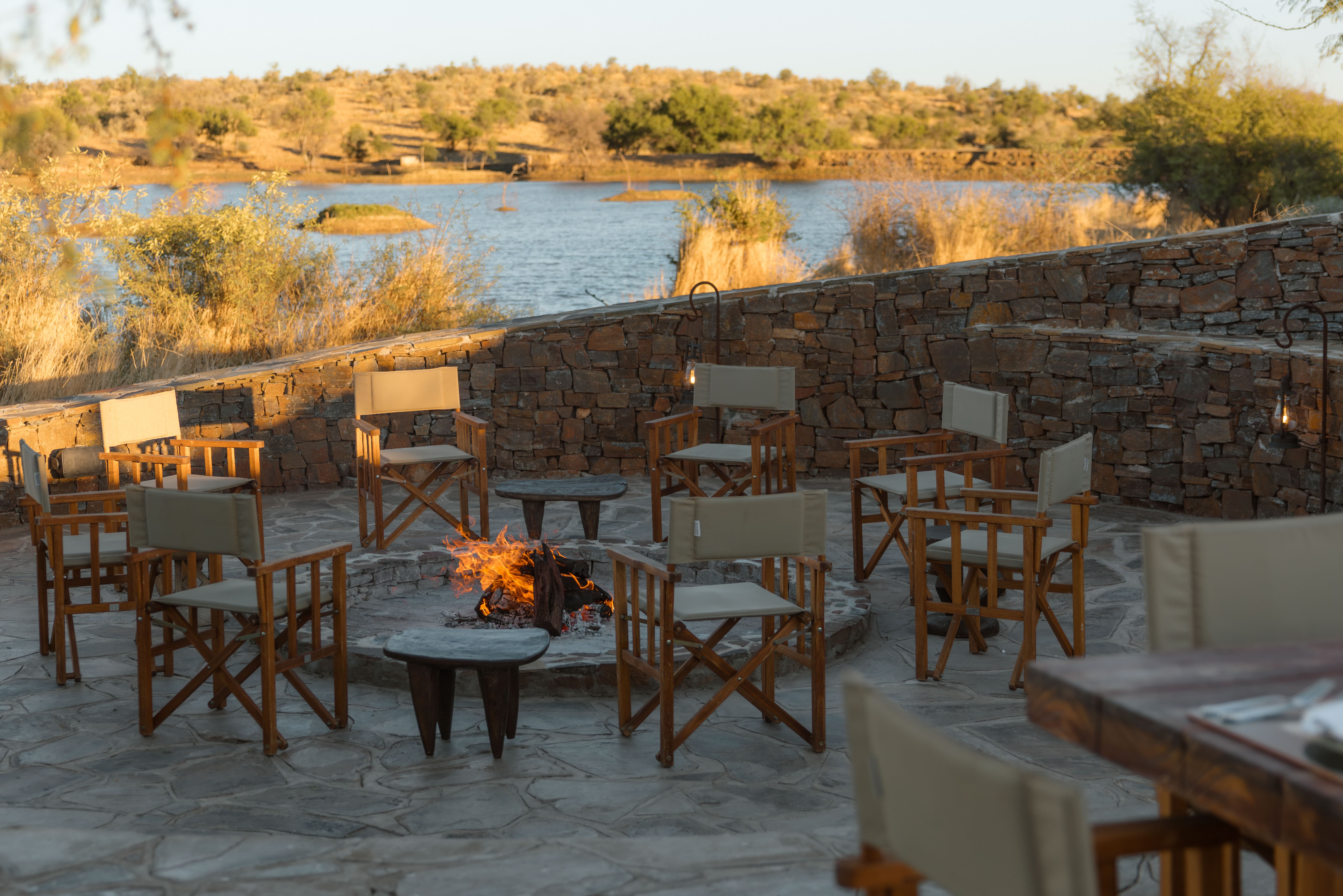 Villas are designed to remain comfortable throughout the year with natural ventilation, shaded terraces, and air conditioning where required. Fireplaces in the villas provide warmth during cooler evenings in the Namibian highlands.