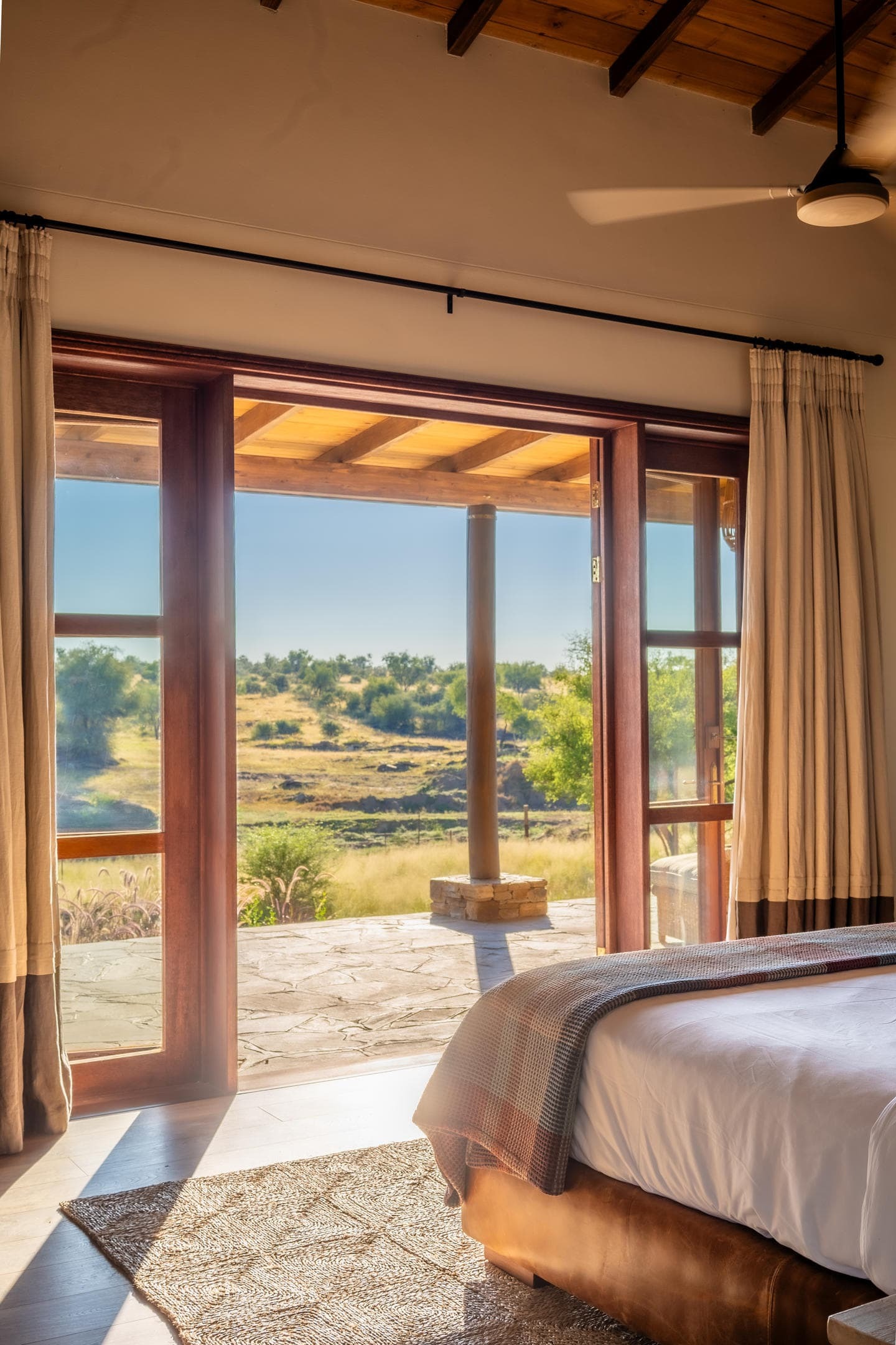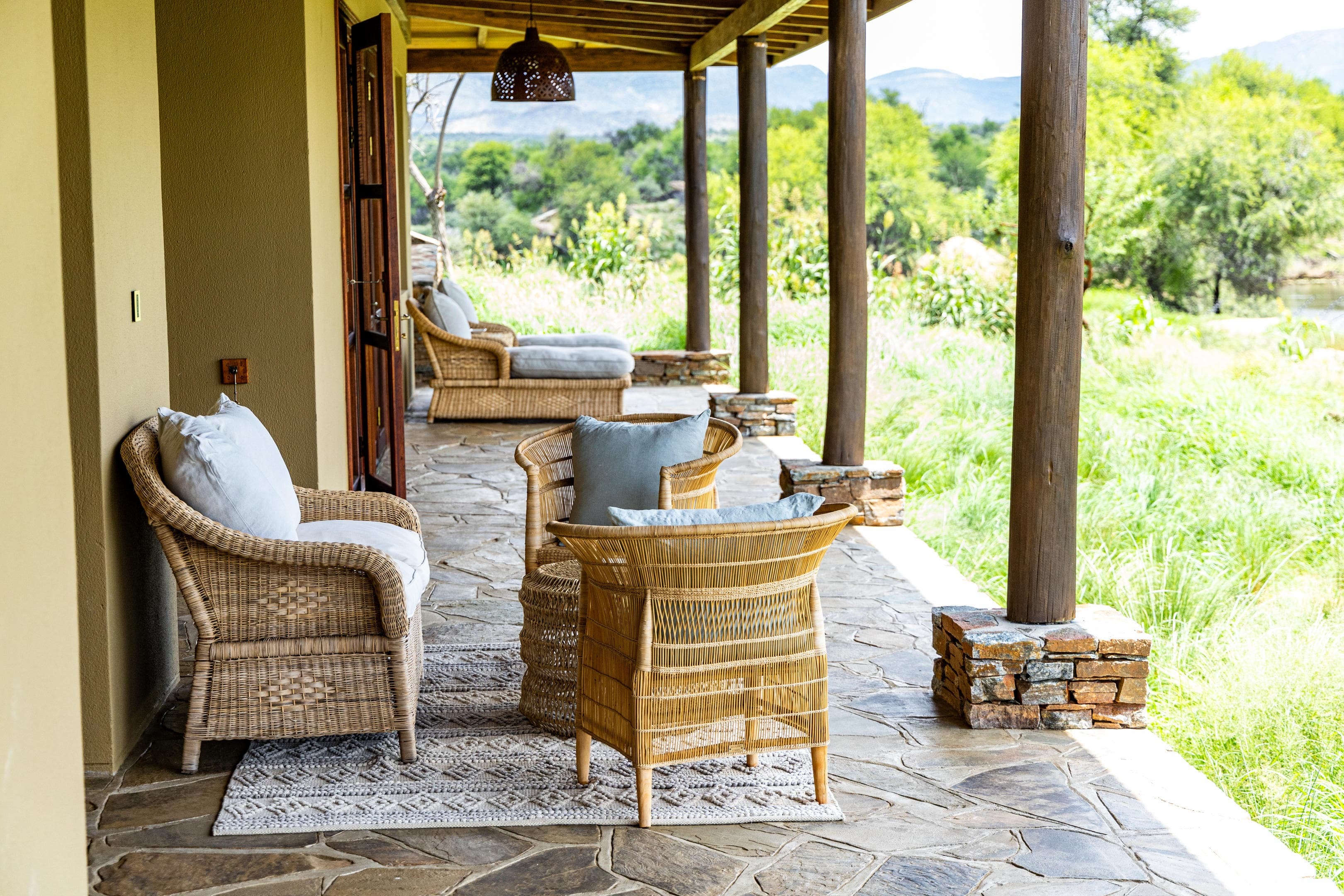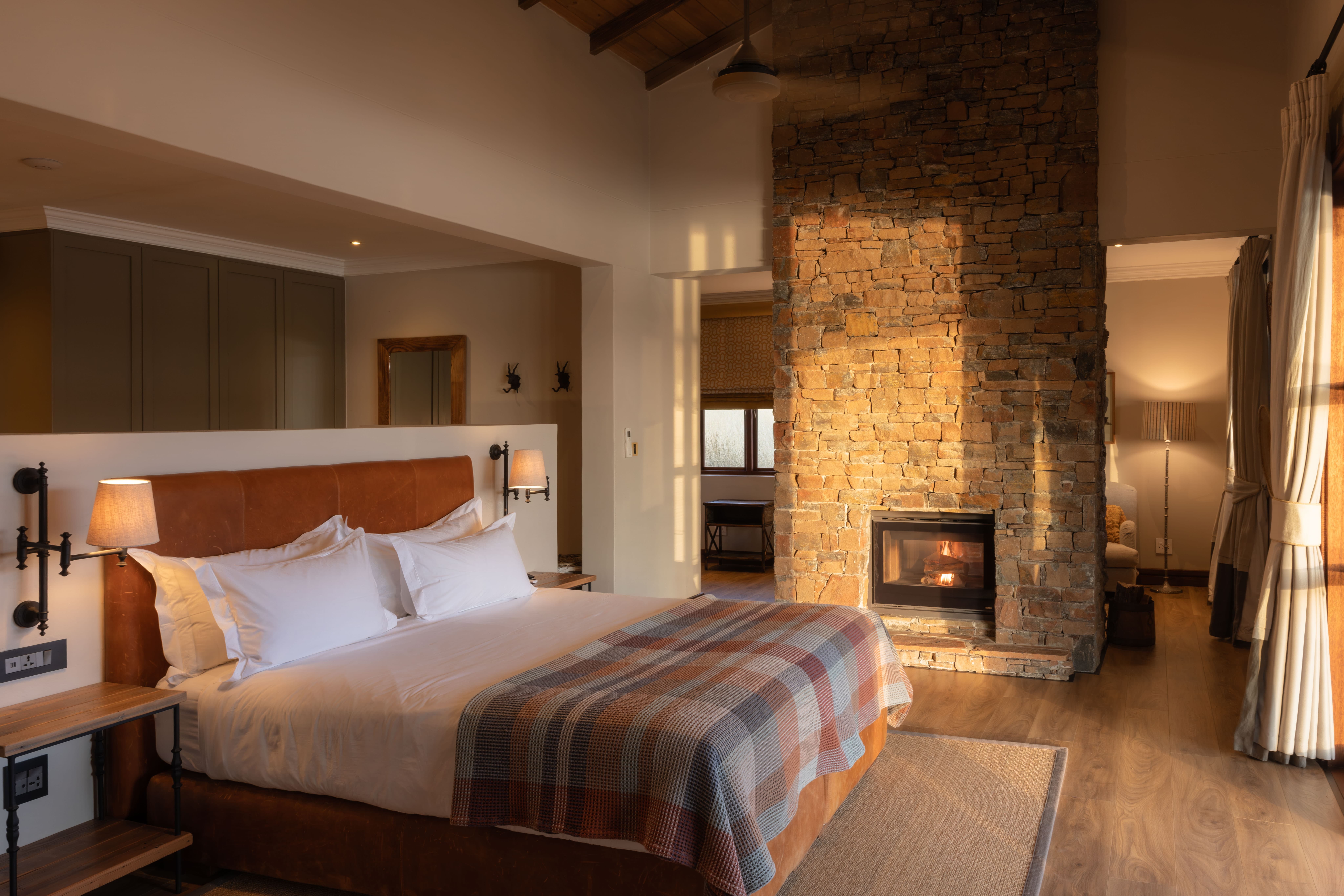 Villas are designed to remain comfortable throughout the year with natural ventilation, shaded terraces, and air conditioning where required. Fireplaces in the villas provide warmth during cooler evenings in the Namibian highlands.