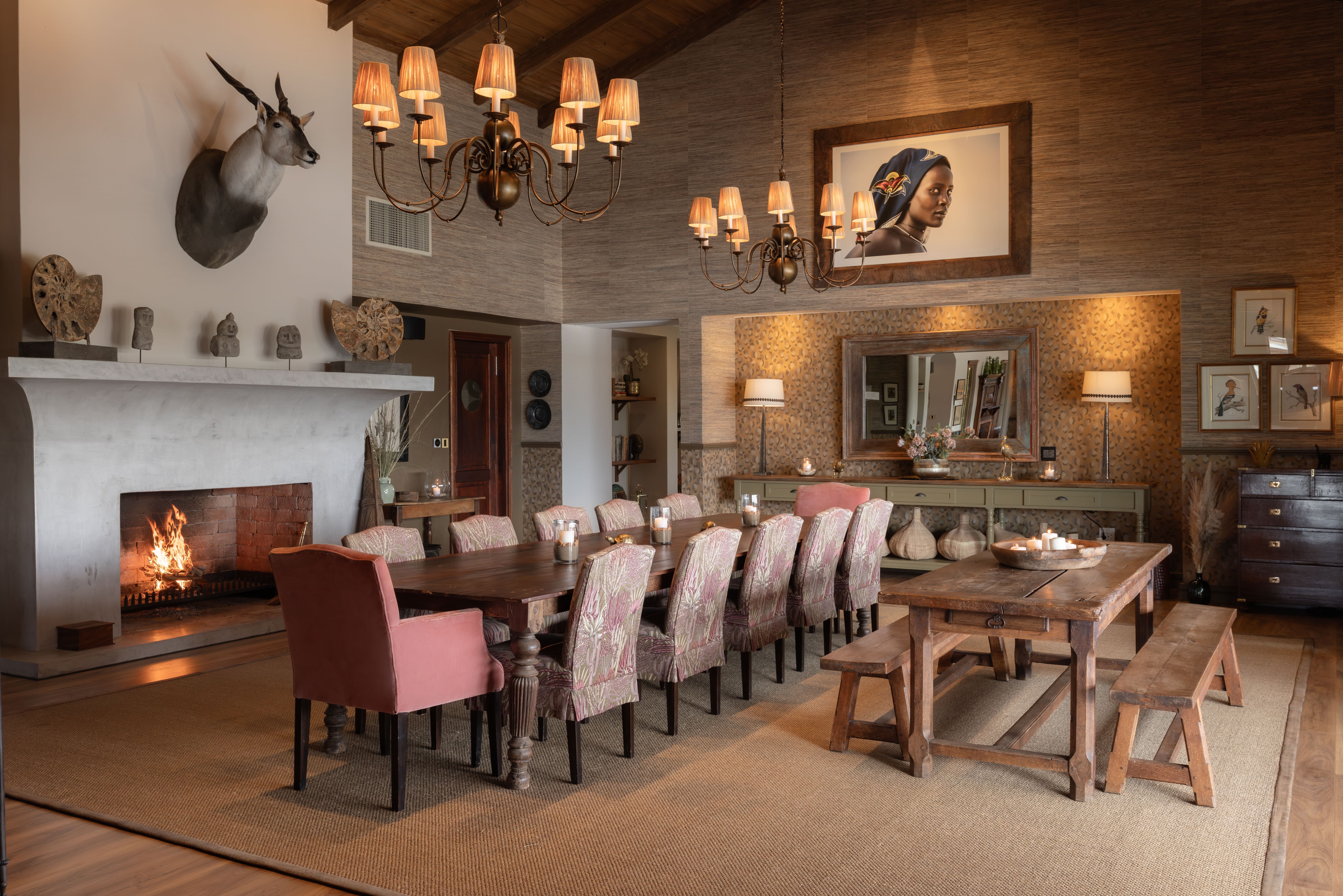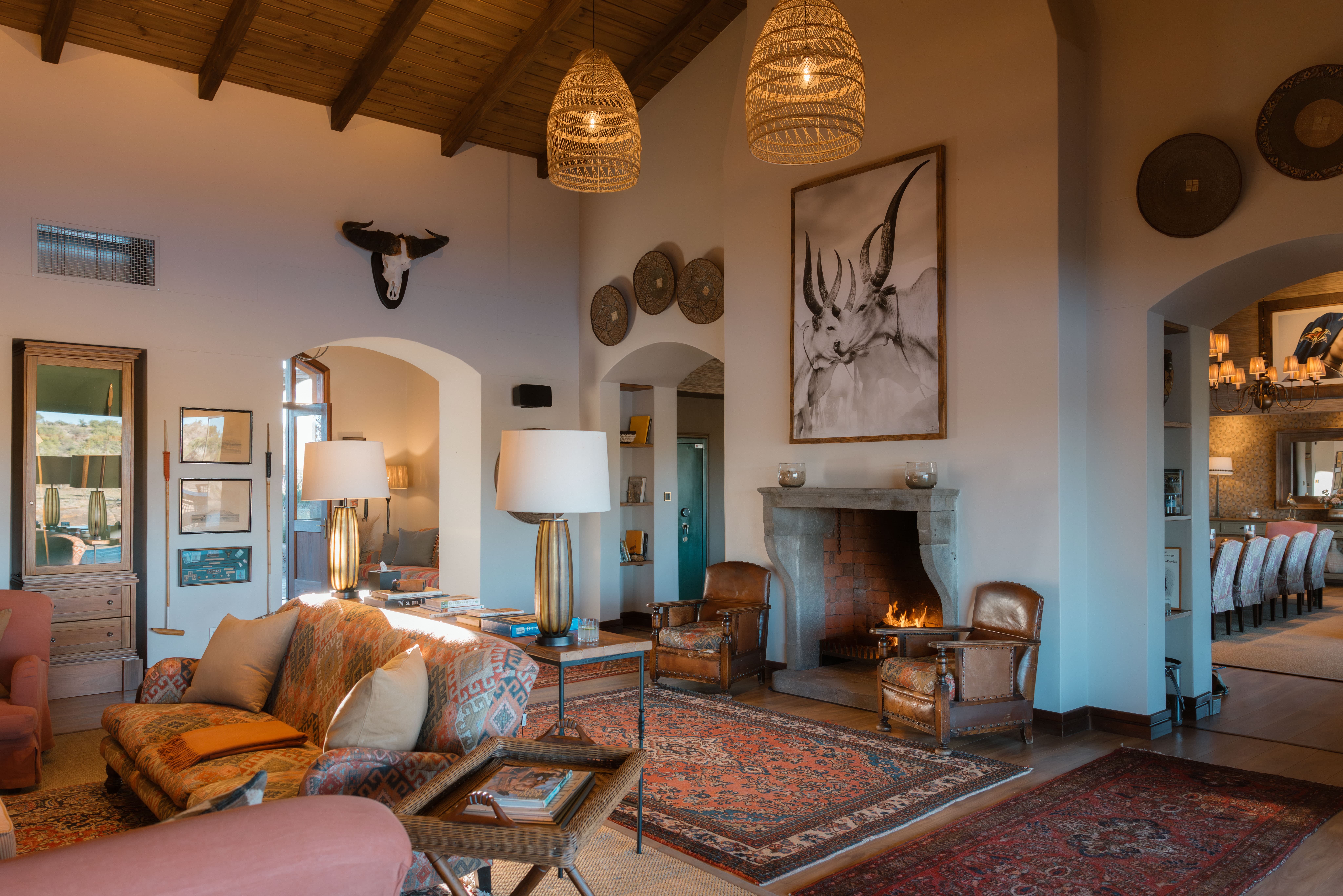 At the centre of the estate sits the main lodge, a warm and inviting gathering space featuring an elegant lounge, bar, dining room and media room with billiard table. Large terraces overlook a tranquil lake where birdlife gathers, while shaded seating areas, outdoor dining spaces and a traditional boma with fireplace and pizza oven create the perfect setting for relaxed evenings beneath the Namibian sky.