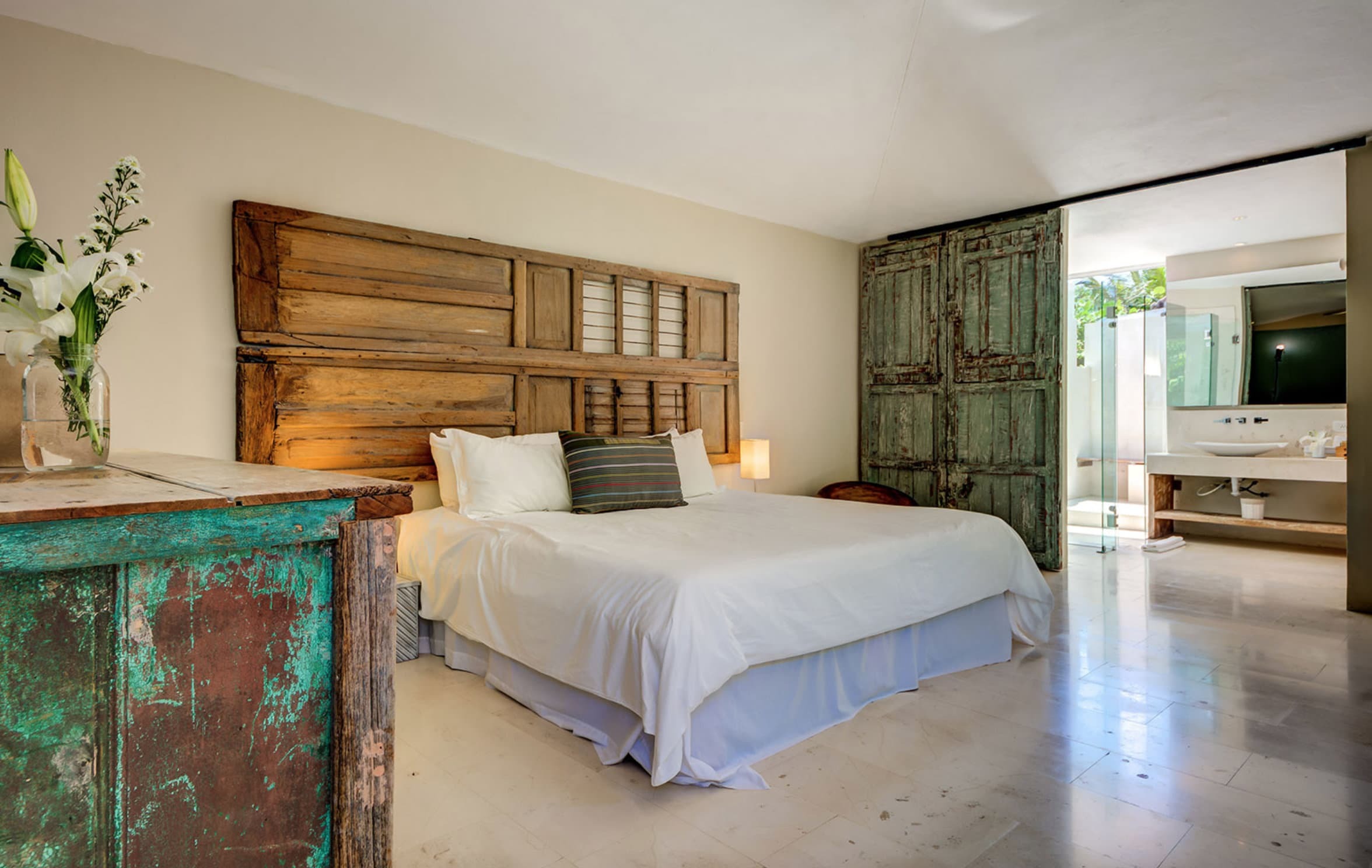 Zacil Na is centred around a calm, light filled open plan living area designed to flow effortlessly toward the sea. A distinctive internal water feature brings a sense of movement and serenity, while wide openings connect the interior to the beachfront terrace and infinity pool beyond. The atmosphere is tranquil, balanced, and ideal for relaxed group living.
